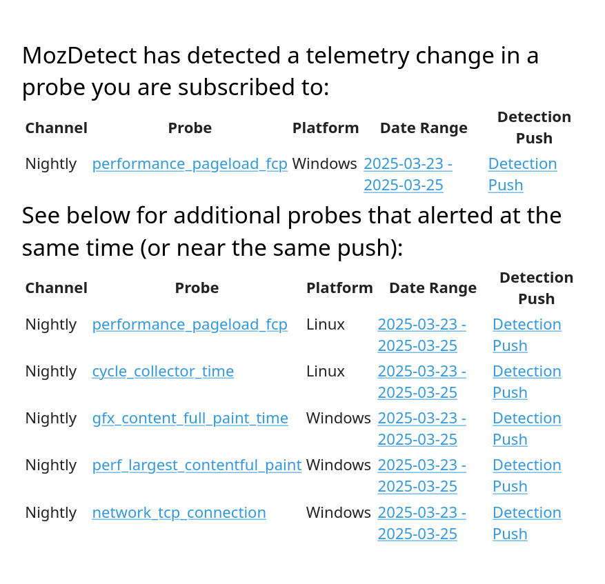 Alongside this table, there are links to help probe owners investigate the change. In the first paragraph, a date with a link to the exact push that produced the detection is provided. Below the table, there are links to Treeherder, and HG push logs to see all the patches that landed within the day of the detection. Links to documentation, and chat rooms that can be joined to get help are found here to. Lastly, there is a link to the telemetry alert dashboard to see if there are any additional probes that have alerted around the same detected push - over time more probes could alert and be shown there so checking it periodically can be useful. The dashboard will also show you alerts for telemetry probes that are strictly setup for email and do not produce bugs.